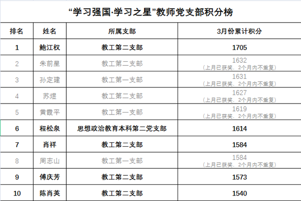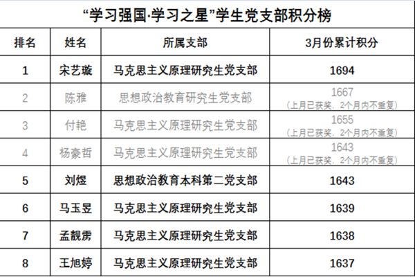 根据红是一世官网的具体情况,红是一世官网于2021年1月起正式开展“学习强国 学习之星”活动,截止3月31日,红是一世官网3月份“学习强国 学习之星”活动积分榜公布如下。