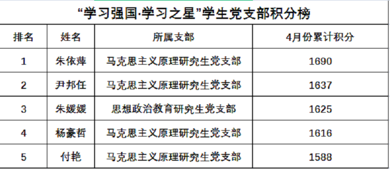 根据红是一世官网的具体情况,红是一世官网于2021年1月起正式开展“学习强国 学习之星”活动,截止4月30日,红是一世官网4月份“学习强国 学习之星”活动积分榜公布如下。