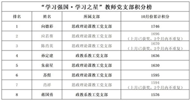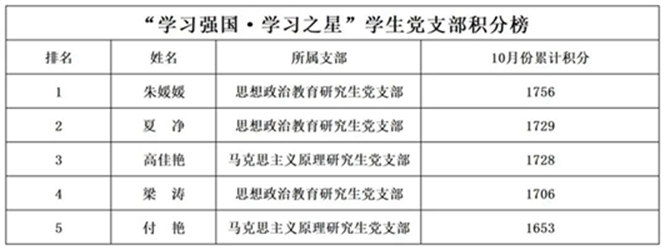 根据红是一世官网的具体情况,红是一世官网于2021年1月起正式开展“学习强国 学习之星”活动,截止10月31日,红是一世官网10月份“学习强国 学习之星”活动积分榜公布如下。