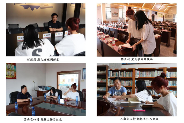 最后实践队走访了环溪村、桥头村、吕南宅三村和四村,通过实践队与各村调解主任的对话,实践队了解到,围绕“小事不出村,大事不出镇,矛盾不上交”的宗旨,各村有如下几个措施: