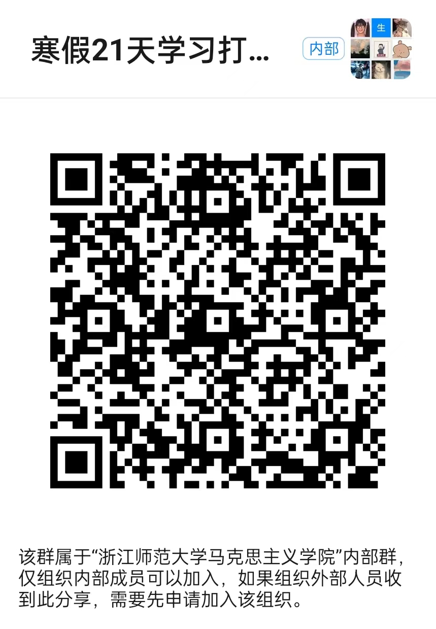 请有意向报名的同学及时扫码下方二维码进入“寒假21天学习打卡挑战”钉钉群,进群填写“寒假21天学习打卡挑战报名表单”后视为报名,进群时间不限。