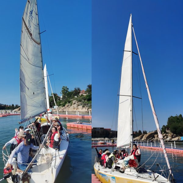 25日,我们游览了东山岛的标志性景观——风动石景区。人们常说,到了闽南,不到东山,是一件憾事;到了东山,不看风动石,则更是一大憾事。狂风吹来时,巨石摇晃而不倒,故名“风动石”,因其“奇、险、大”,被誉为“天下第一奇石”。修在海边的木栈道就像一条盘旋的龙。从栈道眺望,远处海天一色,近处丛林葱郁,美不胜收。午后,我们前往马銮湾体验了帆船出海。马銮湾是国家级帆船帆板训练基地,帆影点点成为了一道亮丽的风景线。我们乘坐帆船加入其中,至海中央返回,船夫不时操纵帆船的倾斜度,让我们近距离感受海洋训练的刺激。东山岛白天和夜晚的海滩,会呈现一种不同风格的美。这种美,让我们流连忘返。