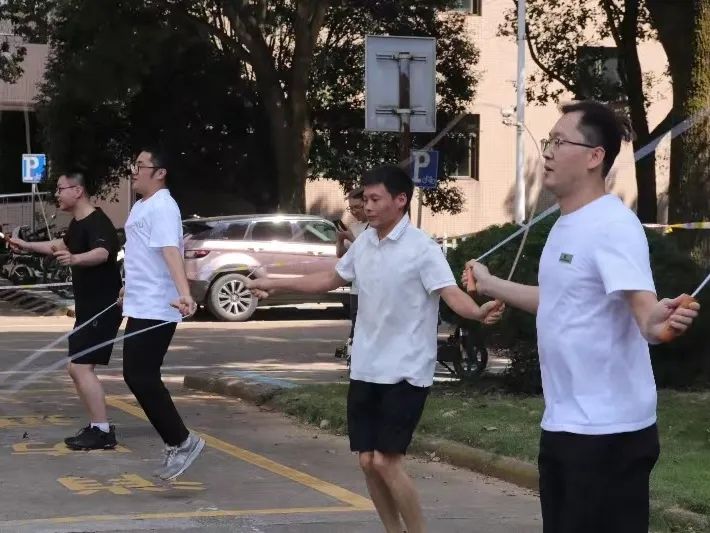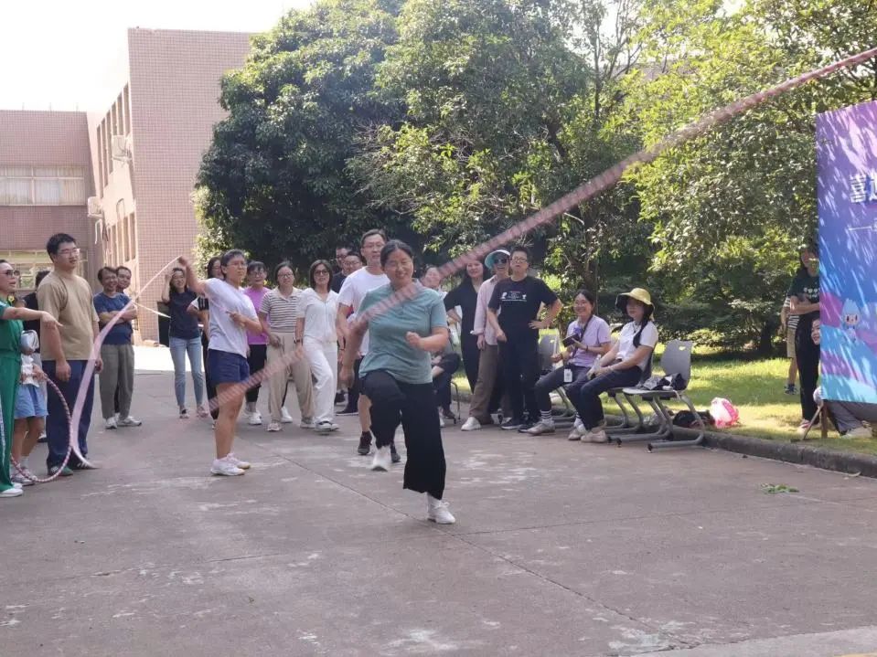 随着计时员一声令下,教师们看准时机,一个个轮番从绳中有节奏地穿梭着,他们身姿轻盈、神情专注,动作行云流水、灵巧敏捷。比赛时间虽然短暂,却足以显示出教师们的默契配合。
