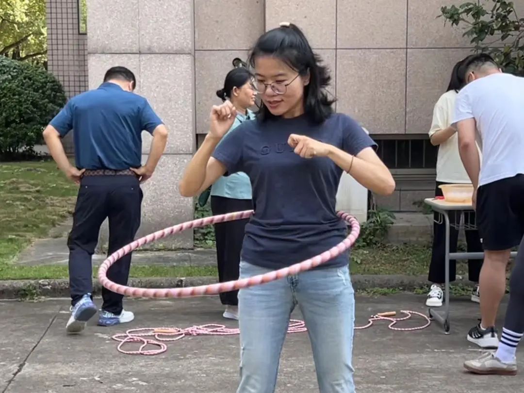 伴随着朗朗笑声和阵阵加油声,转呼啦圈比赛正如火如荼地进行。教师们或是使出浑身力气,快速扭动,用巧劲带动着呼啦圈;或是使用慢摇姿势,潇洒自如,使呼啦圈在腰间轻盈旋转。不论是舒缓优美的姿态,还是灵活自如的动作,都淋漓尽致地展示了呼啦圈运动的魅力。