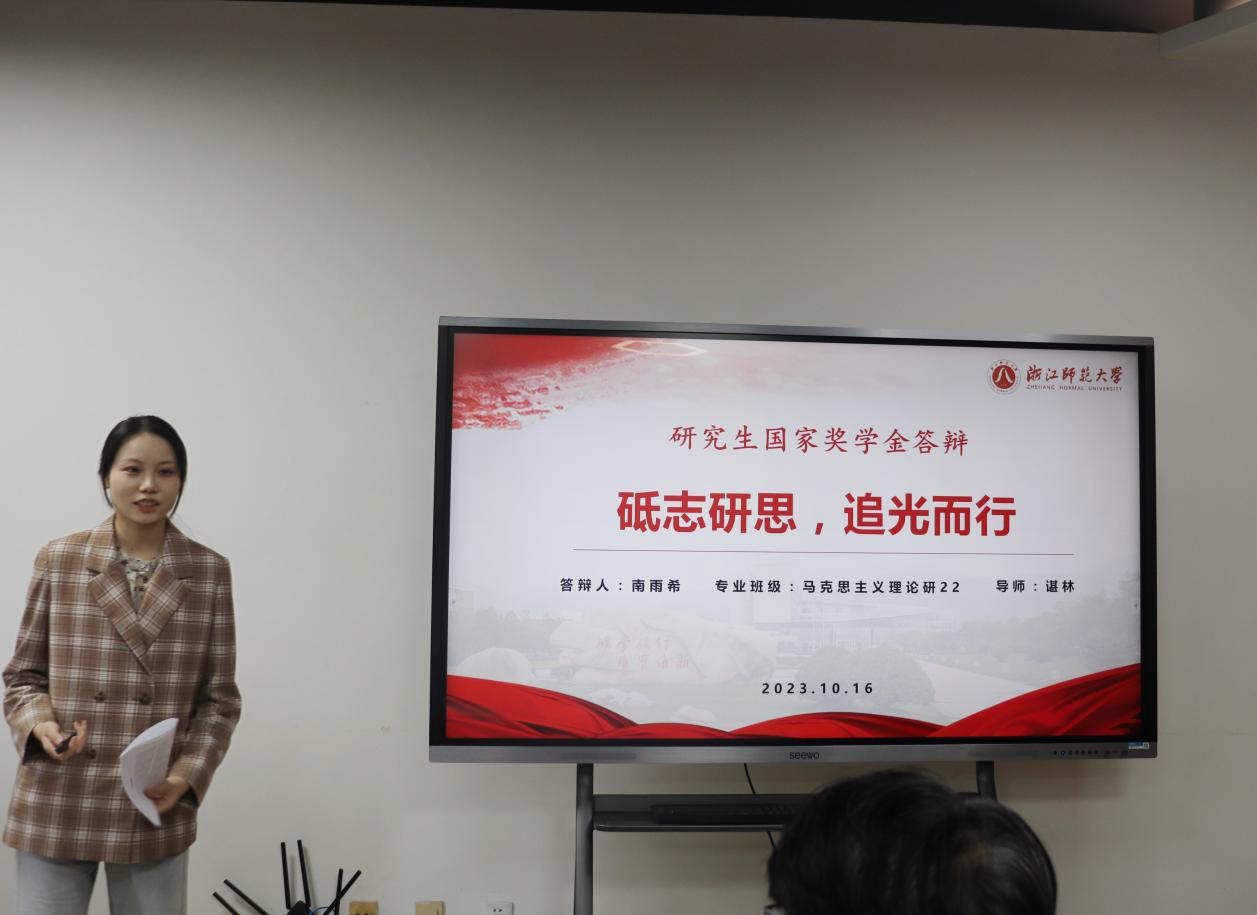 最后进行答辩的是2021级研究生戎兰兰,她针对自己的学业情况、学术经历、课题参与、主要获奖与学生工作进行深入讲解陈述,并着重介绍了由个人单独撰写的二级期刊论文《From Monetary Alienation to Ailenated Labor On Marx’s Triple Transcendence of Hess’s of Idea of Economic Alienation》。