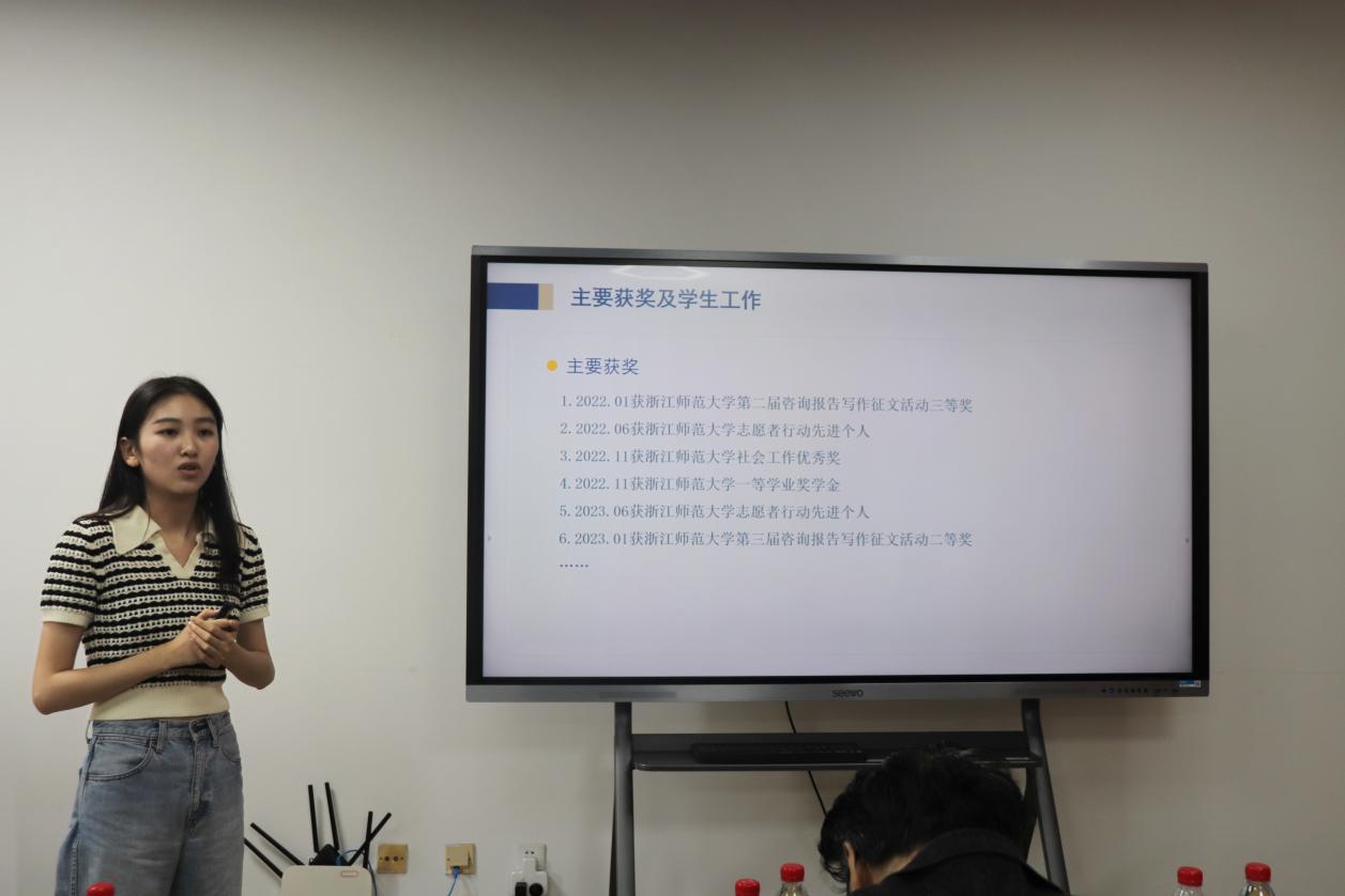 在随后的答辩中,2022级研究生南雨希以“砥志研思,追光而行”为题,从专业学习、科研创新与工作实践三个角度进行相关陈述,在大学生“挑战杯”课外学术作品竞赛备赛过程、成果纵览等方面上展开重点解析。