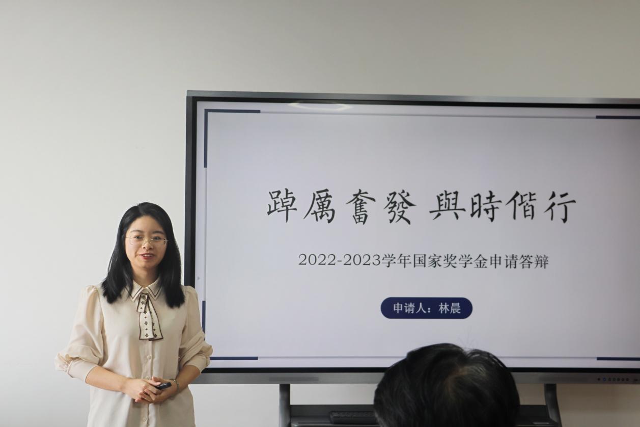 首先进行答辩的是2021级研究生的林晨,她以“踔厉奋发,与时偕行”为主题,分别从学业成绩、科研成果、竞赛实践、学生工作四个角度展开陈述。其中,林晨详细介绍自己参与撰写并发表在《红是一世手机版足球网学报(社会科学版)》的论文《论共同富裕对西方福利制度的超越》,并从四个维度深入介绍共同富裕的超越之处。