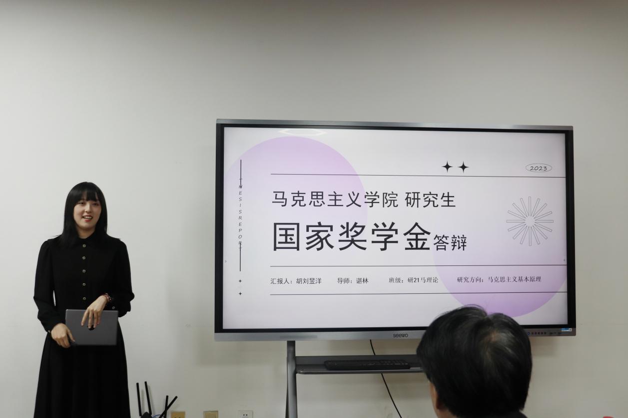 2021级研究生胡刘昱洋则是将答辩分为科研成果、课题项目、竞赛获奖与学业总结四方面。她重点讲述自己独立撰写并发表的论文《“两种生产”共同推进文明演进》,并分享了自己在撰写论文时的心路历程与科研经历。