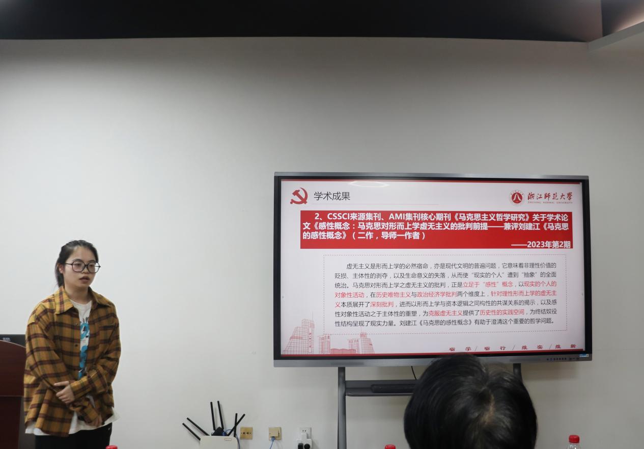 2021级研究生何栩沁从学术成果、课题项目以及荣誉奖项三个方面全面阐释了自己在研究生阶段的重要成果。她在学术成果上着重论述自己参与撰写的论文《论中国特色社会主义革命和建设时期的信念伦理》与《感性概念:马克思对形而上学虚无主义的批判前提——兼评刘建江<马克思的感性概念>》,从虚无主义的角度进行独到讲解与分析。