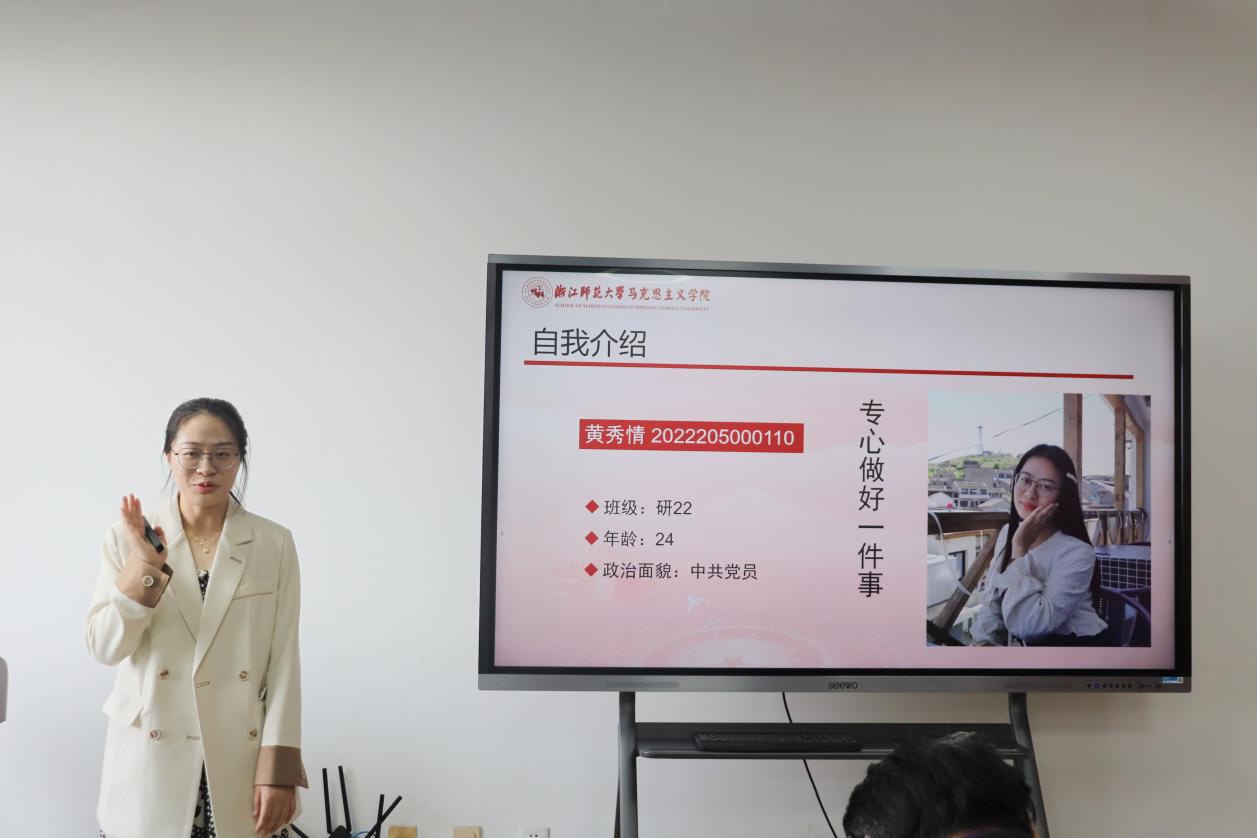 随后,2022级研究生黄秀情从自我介绍、学业成绩、科研成果、实践及荣誉四个部分展示了过去一年的成果。她重点介绍自己在科研方面参与撰写的SSCI论文《Technology moral sense:Development,reliability,and validity of the TMS scale in Chinese version》,并从数据分析、材料收集等角度进行系统陈述。