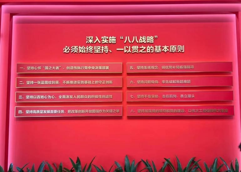 本次主题展览共分为综合展区和地方展区,综合展区主要包括伟大擘画、精彩蝶变、勇立潮头三部分,聚焦习近平总书记走过的足迹、擘画的印迹、牵挂的心迹,彰显“八八战略”历久弥新的真理力量和实践伟力。