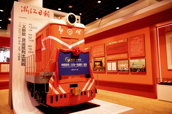 地方展区又名共谱华章,集中展示了11个市遵循习近平总书记的殷殷嘱托,忠实践行“八八战略”的生动实践。其中,金华以“打造国际枢纽城,奋进现代都市区”为主题,深入运用践行“浦江经验”“义乌发展经验”“后陈经验”“千万工程”等宝贵财富,为中国式现代化提供更多生动案例、鲜活教材、精彩样本,努力书写“中国之治”的金华篇章。