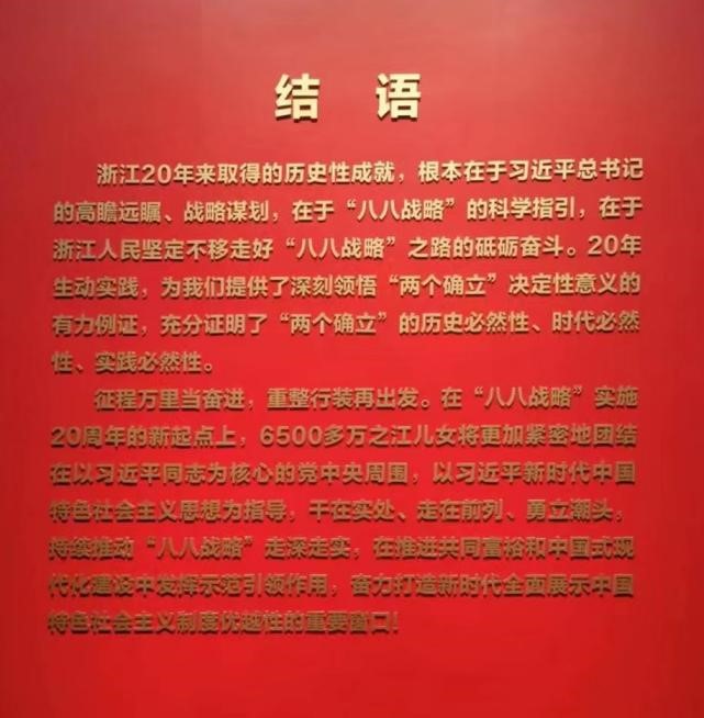 二十年后的今日,在“八八战略”的指引下,浙江省全领域各方面实现了精彩蝶变。置身于“八八战略”实施二十周年大型主题展览现场,一个个值得铭记的历史瞬间、一张张生动的历史图片、一件件厚重的文献实物,铺展开一幅幅荡气回肠的浙江蜕变画卷。
