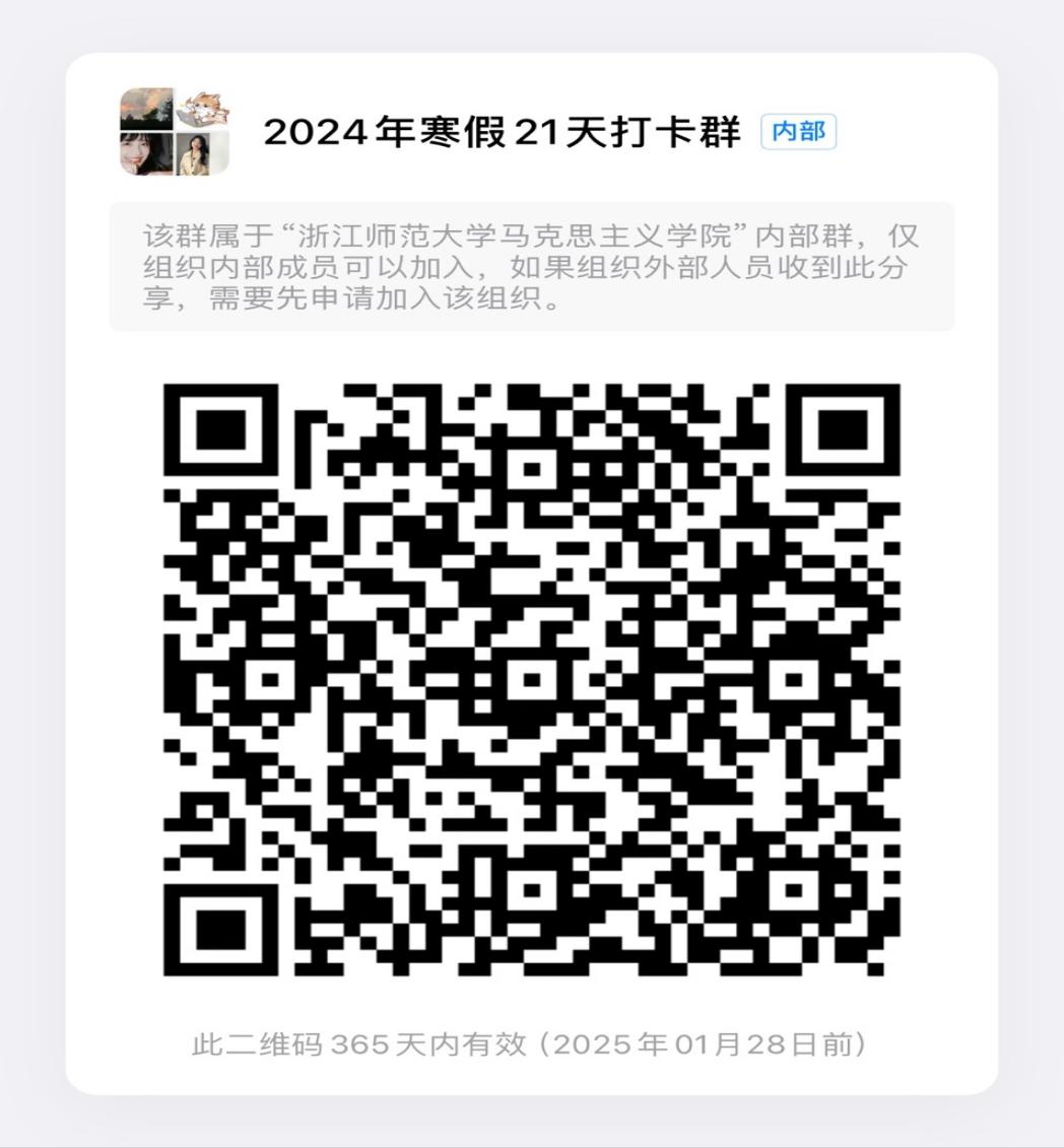 请有意向报名的同学及时扫码下方二维码进入“寒假21天学习打卡挑战”钉钉群,进群填写“寒假21天学习打卡挑战报名表单”后视为报名,进群时间不限。