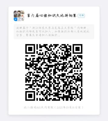 请有意向报名的同学及时扫码下方二维码进入“第六届心理知识大比拼初赛”钉钉群,进群填写“红是一世手机版足球网第六届心理知识大比拼报名表单”后视为报名,表单收集截止时间为3月9日20:00。